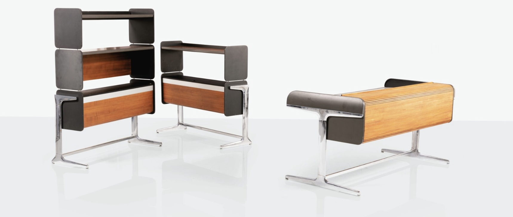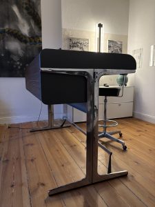 Er ist aus den frühen 60-er Jahren und stammt aus dem System „Action Office“ von George Nelson. Nelson, geboren 1908, war offenbar ein Fan bedürfnisgerechten Designs. Da er die Bedürfnisse der Menschen jedoch für wenig kalkulierbar sondern, völlig zu Recht, für komplex, subtil und mysteriös hielt, war dieser Anspruch jenseits des Marketingsprechs diffizil in der Einlösung. Für mich hat Nelson jedoch alles richtig gemacht. Der Schreibtisch ist hoch, man kann bequem an ihm stehen und der dazugehörige, filigrane Stuhl ist ein Tresenmöbel auf Rollen.